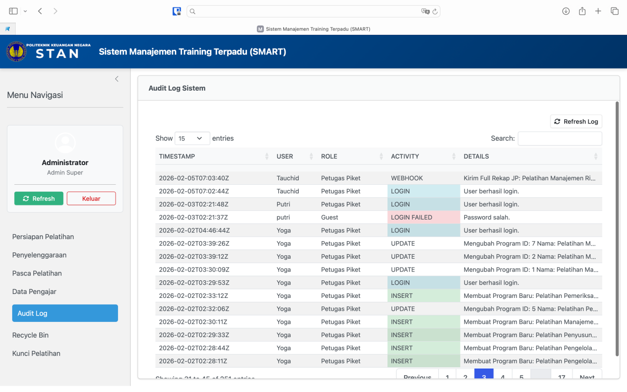 Fitur keamanan untuk melacak seluruh jejak aktivitas pengguna di dalam sistem SMART. Sistem secara otomatis mencatat timestamp (stempel waktu), nama user, peran, tipe aktivitas (seperti login, menambah data, atau menghapus data), dan detail aktivitasnya.
