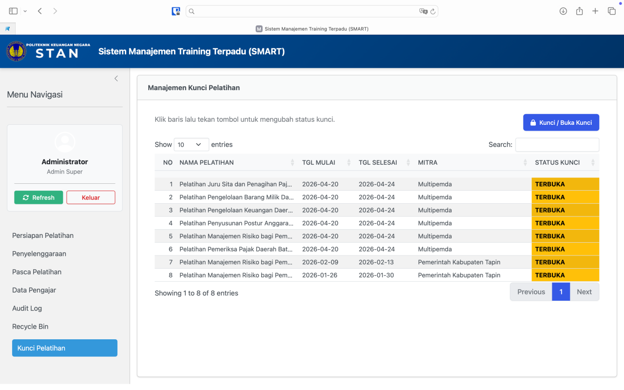 - Klik pada salah satu baris pelatihan, lalu tekan tombol Kunci / Buka Kunci.