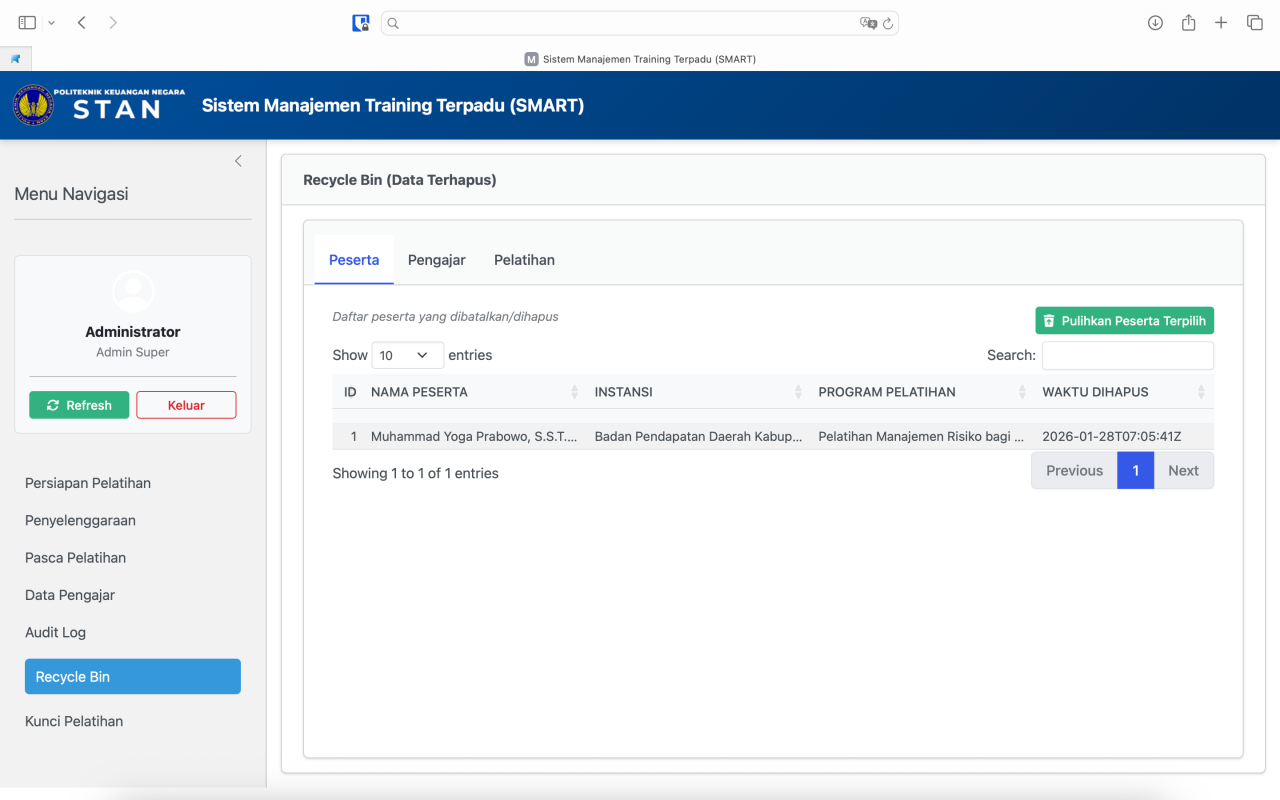 - Cara Memulihkan: Pilih baris data yang ingin dikembalikan, lalu klik tombol Pulihkan (ikon trash-restore). Data tersebut akan kembali muncul di sistem aktif.