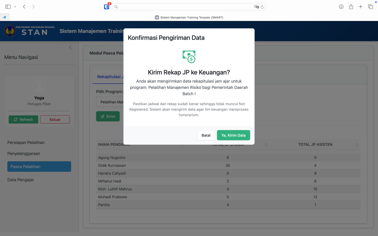 - Kirim ke Keuangan: Pastikan data jadwal sudah final dan benar. Klik tombol Kirim (ikon pesawat kertas hijau). Sistem akan mengirimkan rekapitulasi lengkap (termasuk nama pengajar, NIP, NIK, dan nomor rekening) langsung ke worksheet keuangan (tanpa pengisian form manual) untuk memproses pencairan honorarium.