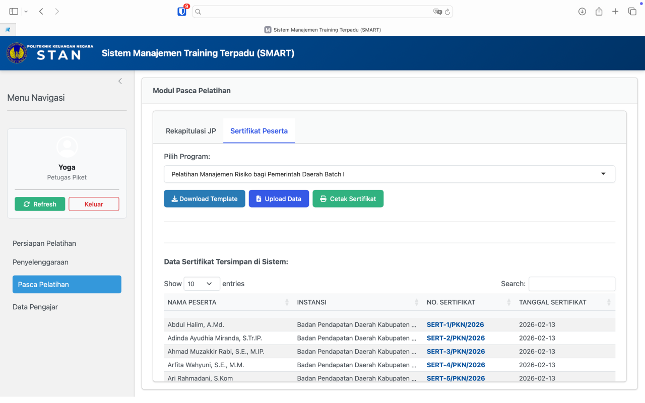 Menu untuk mengelola penomoran dan pencetakan sertifikat tanda tamat pelatihan.